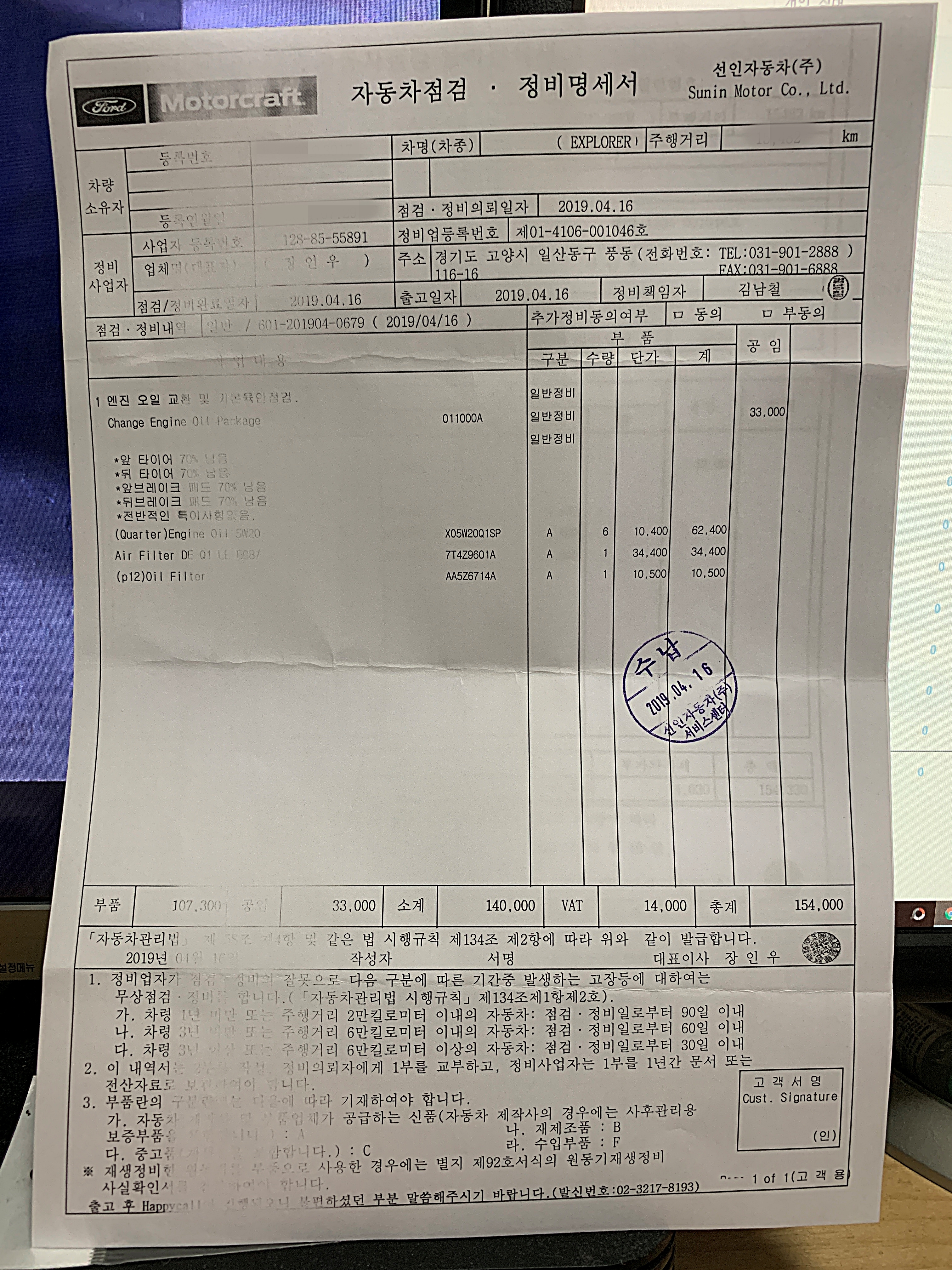 [ 엔진오일 ] 과 [ 에어필터 ] 를 154,000원 주고 교환했습니다. 물론, 기본사항 점검과, 운전석 잠금장치노브떨림, 차량초기화 이후 잠금장치 해제가 운전석만 자동으로 되는 문제 등을 추가로 손봐주었습니다. 그리고, 터널진입시 전조등자동켜짐딜레이 증상은 원래 차량 초기값이라 조정이 안된다는 점도 알게 되었습니다.